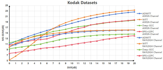 Figure 6 illustrates the correlation between the MS-SSIM values derived from the four codec methods for high-resolution images and the signal-to-noise ratio (SNR) across various channel conditions. The findings indicate that, in the context of AWGN channels with a low SNR, the ADWITT architecture proposed in this study exhibits performance comparable to that of the deep JSCC architecture and the traditional separated source–channel codec approach, while significantly outperforming the conventional WITT model. In scenarios characterized by a high SNR, the ADWITT model maintains performance levels akin to those of the traditional WITT model and demonstrates superior efficacy compared to the other two coding methods. Furthermore, under conditions of RAYLEIGH fast fading channels, the ADWITT architecture consistently exhibits performance similar to that of the traditional WITT model across all SNR ranges, while also outperforming the other two codec schemes. The experimental results substantiate that the ADWITT architecture can reconstruct images of higher quality across diverse channel and SNR conditions, thereby affirming the strong applicability and robustness of the proposed ADWITT model.