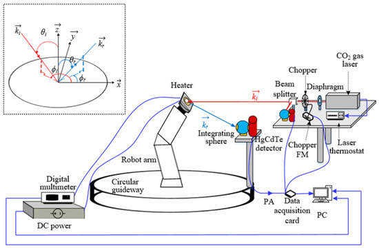 A BRDF measurement system based on a robotic arm was developed according to Equation (2). The system included a laser source module, a motion module, a signal detection and processing module, and a temperature controlling module, as shown in Figure 1. The laser source module provides an infrared light source, the motion module realizes the attitude change of the sample with different angles of incidence and reflection, the temperature controlling module realizes the heating and temperature control of the sample, and the signal detection and processing module realizes the detection of the incident light and the scattered light and is used for data storage and post-processing. The model and main parameters of all equipment in the system are shown in Table 3.