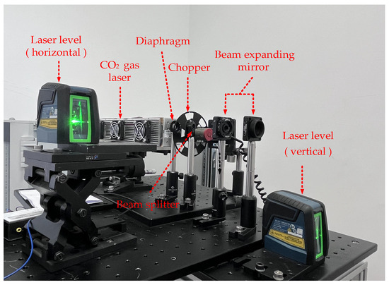 The laser source module, including laser, collimation and beam splitter–expander paths, is shown in Figure 2. The light source module employs a 10.6 μm CO2 laser as the light source, and the optical path is configured with a diaphragm, a chopper, a beam splitter, and a beam expander for adjustment. The diaphragm is employed to regulate the intensity of the beam, with choppers modulating the laser into a fixed frequency of 200 Hz through the filter to remove noise. Beam splitters are used to set up the detection of the optical path for real-time monitoring of the power in situ. Beam-expanding mirrors play a role in making the laser collimation and convergence effect better.