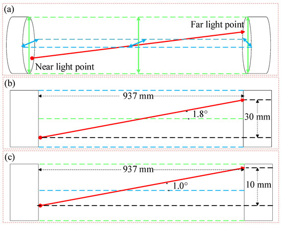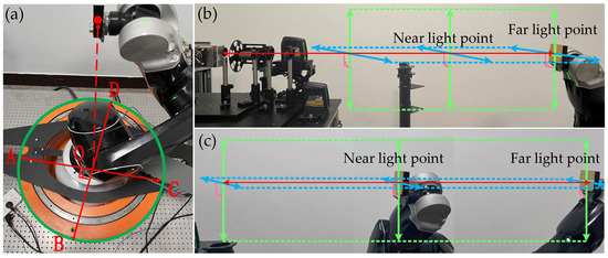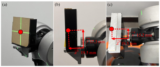Similarly, use the color card to observe the infrared laser irradiation in the sample near the light point and the position of the far light point, the world coordinate system of the axis pitch, and left–right angle adjustment. The adjustment process is shown in Figure 5a. The adjustment of the pitch and horizontal angles are shown in Figure 5b and Figure 5c, respectively. At this time, the incident light coincides with the z-axis of the world coordinate system, completing the adjustment of the optical path and realizing that the laser is always irradiated at the center of the sample when the robotic arm clamps the sample in motion.