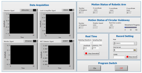 The program enables the real-time monitoring of the robot arm and circular guideway movements, including the number of robot arm movements, the current coordinates of the tool in world coordinates (x, y, z), the number of rotations of the circular guideway, the current rotation speed of the circular guideway, the real-time position of the circular guideway, and the progress of the circular guideway in completing the movement. In the LabVIEW control interface, data reading, display, and storage functions are also configured. These include the reading function, which displays the current waveform of the collected data; the sampling rate, frequency, and amplitude of the real-time display; and the display function, which shows the real-time changes in the collected data across four channels. The storage function stores the collected data in real time. The application of visualization technology enriches the content of the article and enhances comprehension.
