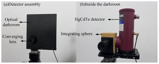 This module uses a HgCdTe detector for incident or scattered light, which is filled with liquid nitrogen and operates at low temperatures for high sensitivity at a wavelength response in the range of 2 to 13 μm. In order to avoid the influence of other stray light during the measurement process, a converging lens, an integrating sphere (diameter of integrating sphere Φ = 60 mm, diameter of inlet Φ = 20 mm, diameter of outlet Φ = 15 mm) and an optical darkroom were designed for the HgCdTe detector. The assembled detector is shown in Figure 9a, with only the converging lens exposed on the outside of the optical darkroom to avoid stray light entering the integrating sphere inlet or outlet junction. Inside the darkroom, as shown in Figure 9b, the converging lens is mounted at the entrance of the integrating sphere, and the exit of the integrating sphere is connected to the detection hole of the HgCdTe detector.