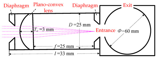 The optical path diagram of the converging lens is shown in Figure 10. The converging lens consists of two adjustable diaphragms (aperture adjustment range 1~12 mm), a plano-convex lens (through the band 8~12 μm, center thickness Tc = 3 mm, focal length f = 25 mm), and an optical sleeve (diameter D = 25 mm, length l = 33 mm). The scattered light from the sample enters into the optical sleeve, and the first diaphragm restricts the incidence diameter of the scattered light. The distance from the plano-convex lens to the entrance of the integrating sphere is equal to its focal length, f = 25 mm, i.e., the plano-convex lens converges the scattered light to the entrance of the integrating sphere, which avoids the secondary reflection of the scattered light in the optical sleeve. A second diaphragm is set in front of the integrating sphere entrance to prevent the stray light reflected twice from the optical sleeve from entering the integrating sphere. The scattered light entering the integrating sphere is homogenized, and the detector detects the scattered light at the exit of the integrating sphere.