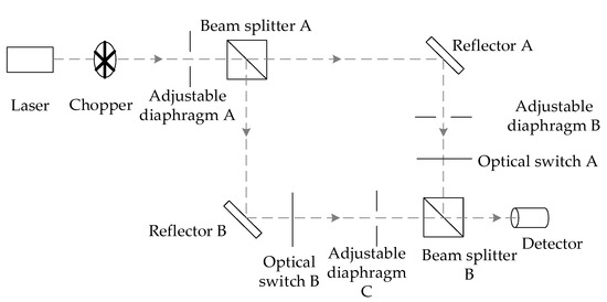 After passing through the chopper, the light from the laser is modulated by adjustable diaphragm A to limit the beam diameter. The beam is then split into two equal proportions by beam splitter A. The beam transmitted through beam splitter A is detected by the detector through reflector A, adjustable diaphragm B, optical switch A, and beam splitter B. The light beam reflected from beam splitter A is detected by the detector via reflector B, light switch B, adjustable diaphragm C, and beam splitter B. The light beam is transmitted through beam splitter A by two equal proportional beams. The single-beam and combined-beam measurements of the two beams are controlled by the optical switches A and B. The signal amplitude of the beam via reflector A is noted as VA, the signal amplitude of the beam via reflector B is noted as VB, and the signal amplitude of the two beams is noted as VA + B. The nonlinear coefficient NL of the detector is defined as: