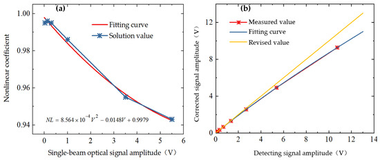 Modification of the aperture of the adjustable diaphragm A results in a control of the output range of the single-beam optical path signal amplitude V within the range of 0.025 to 5.5 V. Calculation of the nonlinear coefficient of the detector is performed in accordance with Equation (5), as illustrated in Figure 12a. When the single-beam optical signal amplitude V is less than 1 V, the nonlinear coefficient is close to 1, and the detector output signal amplitude is close to linear; when the single-beam optical signal amplitude V is greater than 1 V, the nonlinear coefficient gradually decreases, and the detector output signal amplitude sensitivity increases and decreases by orders of magnitude. When the single-beam optical path signal amplitude V = 5.5 V, the nonlinear coefficient decreases to 0.943. A quadratic polynomial is fitted to the nonlinear coefficient to obtain an approximate nonlinear coefficient curve as:
