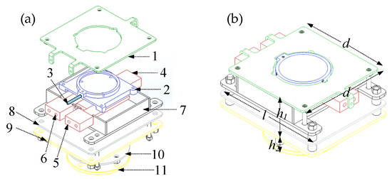 (a) Exploded view of the heater. 1 Heater top cover, 2 Heating tank, 3 Thermocouple, 4–6 heating plate, 7 Insulation shell, 8–11 Insulation layer. (b) Physical view of the heater.