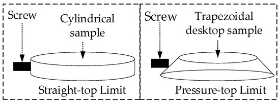 As a result of thermal expansion and contraction effect, the heating and cooling of the sample causes the screws to produce a gap; as a result, the sample will be processed into a trapezoidal desktop sample, i.e., the three screws of the straight top effectively prevent the heated and cooled sample from falling off. A schematic diagram of the sample limit is shown in Figure 14. Similarly, a through-hole with a diameter of 3 mm is tapped into the side wall of the circular groove, and an S-type thermocouple with a diameter of 2.5 mm is inserted into it to contact the sample and measure the temperature of the sample in real time; the temperature is then fed back to the LabVIEW-PID controller for real-time temperature control. The lower part of the heating slot is cut with a rectangular groove of 60 mm in length, 50.3 mm in width, 5 mm in depth, and 3 mm in wall thickness. Three parallel silicon carbide heating rods, each with a power of 400 W, are inserted side by side into the rectangular groove. Since the maximum temperature of the sample heating is 1000 °C, the material of the heating tank is stainless steel GH2747, which can withstand temperature up to 1250 °C. The assembled heating bath is fixed in the heater shell, and the empty space in the heater shell is filled with asbestos for heat preservation. A 55 mm diameter circular hole is cut into the top cover of the heater, which is installed to limit the space of the heating rod and keep its movement stable. After assembling the heating tank, sample, thermocouple, heating plate, heater top cover, and shell, the whole unit is mounted on the four-layer heat insulation board. The heater assembly is shown in Figure 13b, where the heater assembly has length l = 12.4 cm, width d = 10.0 cm, height h1 = 4.80 cm and height h2 = 2.60 cm.