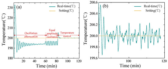 Taking the set temperature of 200 °C as an example, as shown in Figure 15a, the temperature curve oscillates and decays during the time period of 0~60 min and increases to Kp = 5.5. The temperature curve oscillates with equal amplitude during the time period of 60~80 min, and is recorded at Kpr = 5.5 and Tr = 2.83 min, respectively. Then, according to the empirical formula, the PID parameters are set to Kp = 0.6 Kpr = 3.3, Ti = 0.5 Tr = 1.415 min, Td = 0.125 Tr = 0.354 min, respectively. After setting the PID parameters, the temperature rises and stabilizes at 200 °C. The temperature control process is illustrated in Figure 15b, and the maximum temperature deviation from the set temperature is 0.55 °C, which represents a favorable outcome in terms of temperature control.