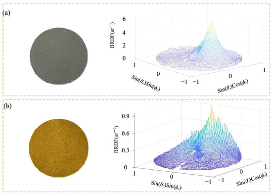 In this section, the validity of the system is verified by measuring the BRDF of specular and diffuse reflection samples at room temperature. The samples measured at room temperature are plated samples and gold plates, and the plated samples are typical specular reflection samples. Under the condition of incident zenith angle θi = 30°, the physical map of the samples and the three-dimensional BRDF distributions are shown in Figure 16a. It can be observed that the scattered light in the hemispherical space of the sample has obvious strength; the peak position of the BRDF is the stronger position of the scattered light, and the lowest position of the BRDF is the weaker position of the scattered light. Under the same incidence conditions, the gold plate is a typical diffuse reflection sample; its sample physical map and three-dimensional BRDF distribution shown in Figure 16b. The sample’s hemispherical space scattered light is still strong and weak respectively, but compared to the plated sample, its scattered light in the sample hemispherical space has a certain component, whereby the three-dimensional BRDF distribution map represents the projection of the BRDF distribution in the hemispherical space of the sample to the two-dimensional plane (x, y) in which the sample is measured, denoted as: