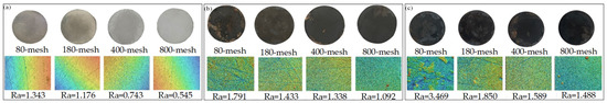 Four stainless-steel 314 samples (SUS314) with a diameter of 50 mm and a thickness of 5 mm, which can withstand temperatures up to 1050 °C, were measured in experiments. Four samples were polished using a metallographic grinding machine. The sandpaper used for polishing were 80 mesh, 180 mesh, 400 mesh, and 800 mesh, and the polished samples are shown in Figure 17a. With the increase in the grit of the sandpaper, it can be directly observed that the scratches are less obvious. The microstructure of the four samples was observed and the surface roughness was measured using a 3D morphometer, and the microstructure of each sample is shown in Figure 17a. In the microstructure of the same area, the surface roughness (average roughness, Ra) of each sample decreases gradually with the increase in the grit of the sandpaper: Ra = 1.343 μm, Ra = 1.176 μm, Ra = 0.743 μm, Ra = 0.545 μm, respectively; the surface microstructure of the 80-mesh sample can be observed in the width and depth of the obvious scratches. Compared to the 80-mesh sample, the surface microstructure of the 800-mesh sample shows obvious fine and shallow scratches, i.e., with a decrease in roughness, the less obvious the scratches in the microstructure of the same area become.