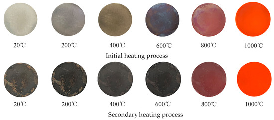In the secondary heating process, we again measure the BRDF value at different temperatures and compared the change rule with the unheated and initial heating samples to analyze the change principle. As shown in Figure 18, when the sample is heated to 400 °C, the sample surface shows no obvious changes and is dark gray; at 600 °C, the sample surface becomes dark black; at 800 °C, the sample surface is slightly bright, with part of the oxide layer sloughed off; at 1000 °C, as before, the real appearance of the sample surface cannot be observed. Comparing the physical map and microstructure of the sample surface after cooling after the second heating, as shown in Figure 17c, the dark gray oxide layer on the surface of each sample turns into dark black after the second heating, and part of the oxide layer falls off. The surface roughness of each sample has increased to a certain extent, but the change in surface scratches is not obvious, i.e., the microstructure of the surface has not changed much and is not easy to observe.