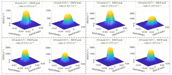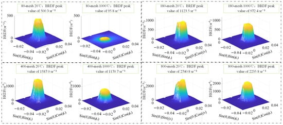 After the initial heating of the samples, the four samples were cooled to 20 °C, and the BRDF spatial distribution of the samples was measured, as shown in Figure 21. Compared with the BRDF spatial distribution when the samples were initially heated up to 1000 °C and then cooled to 20 °C, the peak portion of the BRDF spatial distribution changed from smooth to bumpy. The BRDF peaks of all four samples decreased to different degrees after cooling. It was observed that the surface oxide layer was detached after the sample was cooled, and it was believed that the oxide layer detachment damaged the surface structure of the sample, which made the BRDF peaks continue to decrease during the cooling process. The spatial distribution of the three-dimensional BRDF peak regions of the four samples at 20 °C and 1000 °C during the secondary heating process is shown in Figure 21. The four samples from 80 mesh to 800 mesh showed 80.9%, 20.5%, 26.2%, and 18.4% reduction in BRDF peaks during the second heating process, respectively. During the second heating process, the surface roughness of each sample increased, in line with the law that the BRDF value of the sample surface decreases with the increase in roughness.