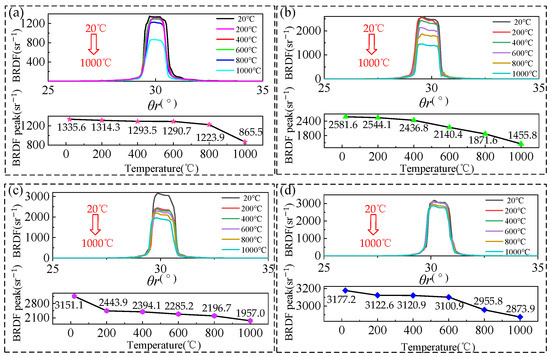 During the initial heating process, the spatial BRDF distribution of hemispherical space on the sample surface was measured for four samples at 20 °C, 200 °C, 400 °C, 800 °C, and 1000 °C. The spatial distribution of the peak BRDF region of the four samples with different roughness at 20 °C and 1000 °C is shown in Figure 19. Since the reflection characteristics of the four samples are specular reflection characteristics, the peak region of the spatial distribution of the three-dimensional BRDF changes significantly during the heating process, and the other spatial distribution components do not change significantly, so the three-dimensional BRDF distribution of the four samples only shows the region near the peak. The four samples from 80 mesh to 800 mesh showed 35.2%, 43.6%, 37.9%, and 9.5% reduction in BRDF peaks during the initial heating process from 20 °C to 1000 °C, respectively.