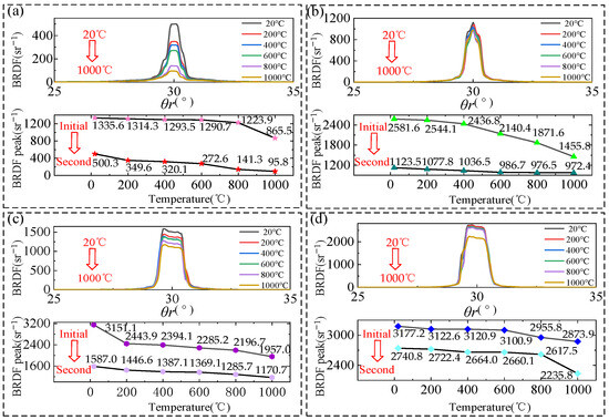 In summary, during the initial heating process, with the increase in temperature, the surface structure of the samples is damaged. Higher temperature causes greater damage to the surface structure, and the BRDF values of the samples show a sharp decrease with the increase in temperature. For the samples with large surface roughness, the high temperature destroys the surface structure more violently, then the BRDF value of the samples with large surface roughness decreases violently with the increase of temperature, and the surface roughness of the small samples of the BRDF value of the temperature with the increase of the slow decrease. After heating samples cooled to room temperature back up to 1000 °C, the shedding of the sample’s surface oxide layer led to the continued destruction of the surface structure. During the process of initial heating and cooling to room temperature, the BRDF peak continues to decrease. During the second heating process, high temperature does not cause obvious damage to the surface structure of samples with different roughness; with the increase in temperature, the BRDF value shows a gentle decrease.