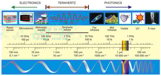 Electromagnetic radiation known as the terahertz (THz) range (Figure 1) is considered the least explored range of optical radiation and poses a challenge to both science and the development of technologies in electronics and photonics. It is situated between infrared light and microwave radiation with a spectral region in the frequency range from 0.1 THz to 10 THz (wavelengths from 30 µm to 3 mm). It is partly overlapping with a loosely treated submillimeter (sub-mm) band of (0.1–3) THz.