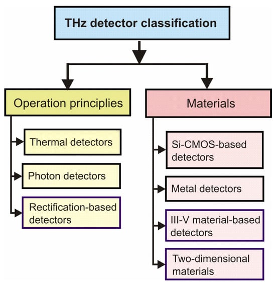 THz detectors can be classified based on operation principles, used materials, and applied measurement methods (Figure 3).