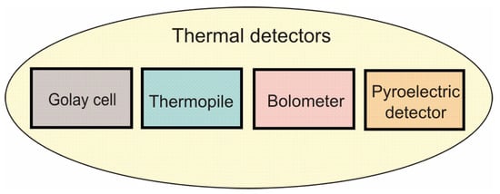 Thermal detectors can be subdivided into Golay cells [], thermocouples/thermopiles [], bolometers [], and pyroelectric detectors [] (Figure 5).