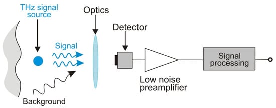 Figure 6 shows a simplified diagram of the direct detection system. In this design, it is necessary to minimize the noises from various sources, i.e., background, detector, preamplifier, and any signal processing unit. If further noise minimization of the system is not possible, advanced methods of THz detection can be used (e.g., lock-in) [,].