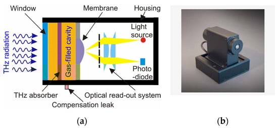 The Golay cell is one of the oldest designs of THz detectors. As shown in Figure 7, the core part of the Golay detector is a gas-filled cavity. There are usually selected argon or xenon due to their low thermal conductivity. One wall of the cavity is equipped with a THz absorber, and the other wall of the cavity is a flexible membrane with a mirror.