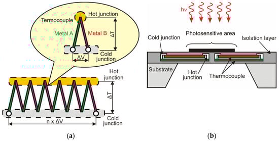 Thermocouples are made as single elements, with double or quadruple structures, as 16- or 32-element lines, and as mosaics with a small number of elements (e.g., eight × eight). In practical applications, a single thermocouple is not used. When N thermocouples are connected in series a thermopile is obtained, the responsivity of which is improved by N [].
