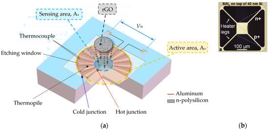 (a) Structure view of the CMOS–MEMS thermopile []; (b) an image of the Si nanomembrane thermal detectors [].
