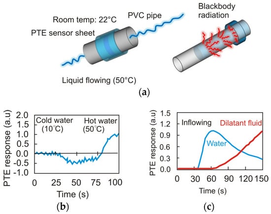 (a) Conceptual diagram of BBR-based PTE passive liquid monitoring with the device; device responses during liquid flowing (b) in different temperatures and (c) in different viscosities (adopted after []).