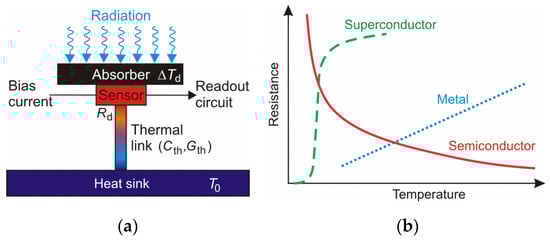 Generally, a thermal detector contains a thermometer and a thermal link (Figure 4a). The thermometer itself combines a radiation absorber and a temperature transducer. Incident radiation causes a temperature rise in the thermometer (ΔT) with a change in some of its physical properties (Figure 4b). This change is processed by a read-out circuit [].