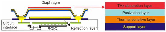 The pixel is composed of a diaphragm, cell contact, and two legs to support the diaphragm. The diaphragm consists of a THz absorption layer (Ti), passivation layer (Si3N4), thermal sensitive layer (VOx—with TCR~−2.3%/K), and support layer (Si3N4), with a reflection layer placed 2.5 µm away. The reflection layer was made of NiCr thin film. To improve the rate of temperature rise (low thermal mass), the diaphragm was suspended on lags connected to the heat sink. The signal of the pixel is sent through the cell contact to readout integrated circuit (ROIC). Its basic function is to amplify and process the THz detected signal. Responsivity and NEP of the FPA were 2186 V/W and 45.7 pW/Hz1/2, respectively, for 2.52 THz radiation generated by a CO2 laser [].
