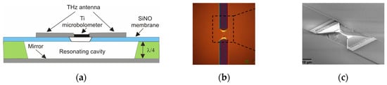 Using an additional optical cavity (formed as a vacuum gap ‘g’ between the bolometer and the reflector ‘r’) ensures obtaining absorbance close to unity in the wavelength range of 37–200 µm []. In addition, such bolometer structures provide both selective and broadband THz detectors. Gou et al. [] developed a 320 × 240 THz focal plane array with 35 mm pitch pixels (Figure 14).