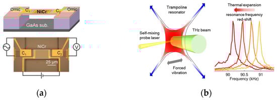 The support layer and the top gate electrodes on the two ends of the beam form two piezoelectric capacitors, C1 and C2. An AC voltage is applied to C1 to drive the beam, and C2 detects an induced oscillation signal. The upper and lower parts of the Figure 16a are two projections of one structure. The noise equivalent temperature difference is about 1 μK/√Hz), and NEP is ~90 pW/√Hz []. The bolometer is very sensitive and more than 100 times faster than other uncooled THz detectors, and its operation bandwidth is several kHz.