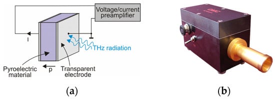 (a) Scheme of a pyroelectric detector; (b) QMC Instruments Ltd. (Cardiff, UK) room-temperature pyroelectric THz detector [].