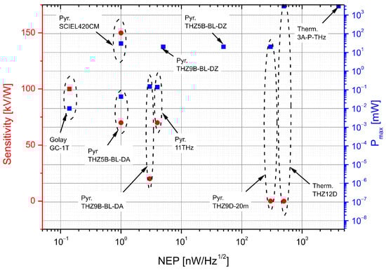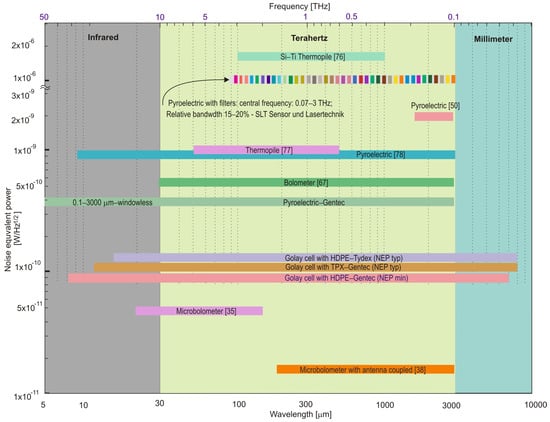 The main factor, influencing the interest in THz thermal detectors, is their wide characteristics of spectral sensitivity. A brief analysis of scientific works described in the literature was carried out and supplemented with data on commercially available detection heads. Figure 22 presents a unique summary of THz thermal detectors’ spectral operational ranges and NEP levels. Additionally, the transmission spectral ranges of the THz filters that can be used to match the detectors’ sensitivity spectrally are placed on the characteristics.