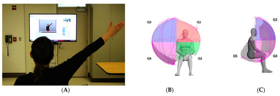 Reachable workspace with component quadrants. Reachable workspace system set up with a participant undergoing arm movement protocol in front of the video guide and Kinect sensor (A). An individual’s reachable workspace, reconstructed from the collected arm movement tracing illustrated by the dotted lines, and the visual output of relative surface area (RSA) envelope shown with four frontal quadrants Q1–Q4 (B) and one posterior inferior-lateral quadrant Q5 (C): Q1–Q4 are frontal quadrants viewed from the front (B); Q1, medial upper quadrant; Q2, medial lower quadrant; Q3, lateral upper quadrant; Q4, lateral lower quadrant; and Q5 lateral view (right side shown).