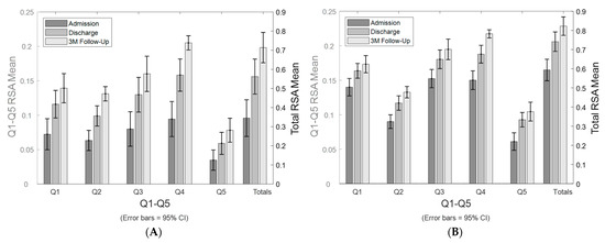 (A) The mean relative surface area (RSA) of the stroke-affected arm by individual and total quadrants at admission, discharge, and at the 3-Month follow-up. (B) The mean relative surface area (RSA) of the non-paretic arm by individual and total quadrants at admission, discharge, and at the 3-month follow-up.