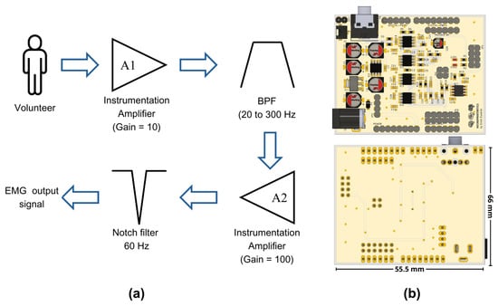 (a) Muscle signal processing stages implemented in the EMG prototype and (b) the design of the electronic board using EAGLE software; top and bottom views.