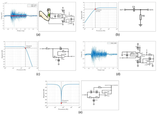 Stages of muscle signal processing implemented in the EMG prototype. (a) Diagram of signal pre-amplification using an instrumentation amplifier; (b) passive high-pass filter; (c) active low-pass filter; (d) the second stage of amplification; and (e) 60 Hz notch filter.