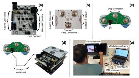 (a) The final version of the EMG prototype includes connectors compatible with the Arduino UNO model and connectors for interacting with other electronic boards; (b) electronic board for the communication of muscle signals after processing; (c) electronic circuit that interacts with the skin surface, indicating the connections of the electrodes and the U1 connector to interact with the EMG prototype; (d) connection of all modules; and (e) volunteer with the setup during the recording session.