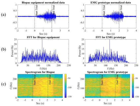 (a) EMG signals in the time domain: the left side shows the signal acquired by the Biopac® equipment, and the right side shows the EMG signal recorded with our prototype. The dashed lines indicate the start and end marked with the visual interface. (b) Frequency analysis using the Fourier transform after applying a band-pass filter from 20 to 200 Hz. (c) Spectrogram of each of the signals.
