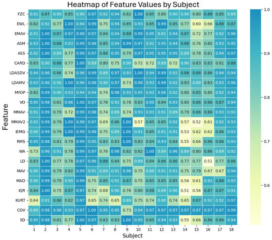 Heatmap of feature values by subject, showing the (1 − MAPE) values for each feature and subject. Darker colors indicate better agreement between the EMG prototype and Biopac® equipment.