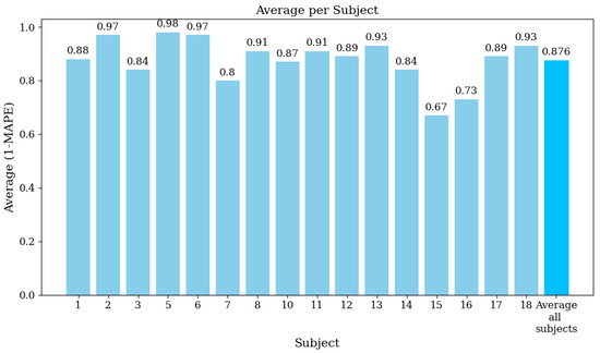 Average (1 − MAPE) per subject, showing the agreement between the EMG prototype and Biopac® equipment for each subject.