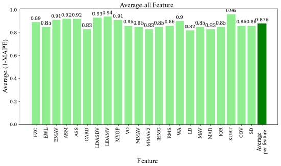 Average (1 − MAPE) per feature, showing the agreement between the EMG prototype and Biopac® equipment for each feature.