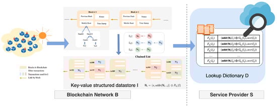 To initial , generates n virtual linked lists organized by labels . Each list consists of nodes with a unique record of the same label, which is stored in a transaction of the blockchain network. The structure of a node in list is defined as , where v is the unique record and is the transaction address of the previous node in . Then, it is XOR-encrypted, using as to protect the privacy of the real key-value records against the blockchain network. Additionally, to allow to perform a Boolean query in , initials a key-value dictionary that contains all label information as the keys. For each label l, the corresponding value in is the transaction address of the head node in the linked list , i.e., and the accumulator value . Using pseudo-random function F, encrypts the label l into and encrypts the corresponding value as : .