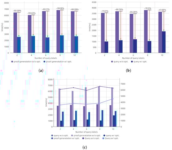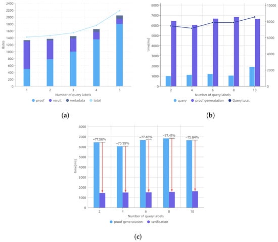 The computation overhead comprised the query overhead and verification overhead, as illustrated in Figure 3b,c. Figure 2b demonstrates that the time overhead for querying the blockchain was approximately linear with respect to the number of labels. The proof generation process took longer than the query process, due to the more complex exponentiation and bilinear pairing operations. Despite the variation in the number of labels, the time overhead remained relatively stable, which was consistent with the theoretical analysis.