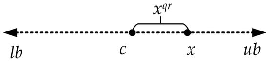 If x is a point in the search interval [lb, ub] and c = (lb + ub)/2 represents the midpoint of the search interval, then the quasi-reflection point corresponding to point x can be calculated using Equation (18). The relative positional relationship between a random point and its quasi-reflection point in the search interval is depicted in Figure 5.