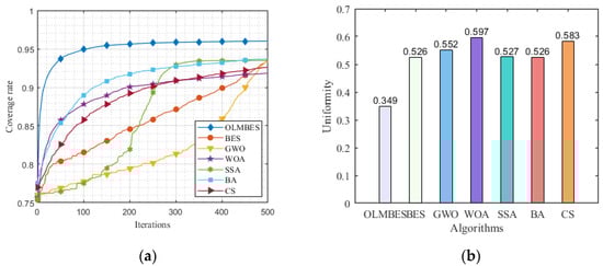Figure 10a and Figure 10b, respectively, show a histogram of the average coverage rate and a line chart of uniformity in the same monitoring area with different total numbers of sensor nodes. It can be seen from Figure 10a,b that when the number of sensor nodes is identical, the average coverage rate and uniformity of the solutions provided by the OLMBES algorithm are always better than the other six algorithms.