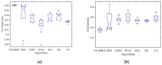 In order to verify the robustness of the OLMBES algorithm, boxplot is employed to describe the data distribution of the coverage ratio and uniformity obtained by running the seven algorithms repeatedly in the same environment, and it is a kind of statistical graph showing the distribution of a set of data by indicating the maximum, minimum, median, upper and lower quartiles, and outliers. Figure 9a shows a boxplot graph of the network coverage rate optimized by the seven algorithms. For the indicator of network coverage rate, a larger value of network coverage rate indicates better coverage performance of sensor nodes in the network. As shown in Figure 9a, the upper quartile, median, and lower quartile of the OLMBES algorithm are higher than the other six algorithms, equipping the shortest interquartile range and no outliers, indicating that the OLMBES algorithm has excellent global search ability and strong robustness. Compared with the other six algorithms, the boxplot height of the OLMBES algorithm is the shortest, which indicates that the OLMBES algorithm has a small degree of data fluctuation and can provide a feasible solution with a high coverage ratio for the coverage optimization problem. In the boxplots of the BES, WOA, and CS algorithms, there are outliers that deviate from the average coverage level, which indicates that the solutions provided by these algorithms in optimizing the deployment of sensor nodes are unstable. Compared with the GWO, WOA, SSA, BA, and CS algorithms, the median line of the BES algorithm is significantly higher than these five algorithms, but the BES algorithm has a longer interquartile range and greater data volatility, further indicating that the BES algorithm has a strong global search ability and poor stability. Similarly, Figure 9b shows a boxplot graph of the uniformity obtained by the seven algorithms. For the network uniformity, a lower value indicates a better distribution performance of sensor nodes in the network. As shown in Figure 9b, the upper quartile, median, and lower quartile of the OLMBES algorithm are all lower than the other six algorithms, indicating that the optimized node deployment position of the OLMBES algorithm has the highest degree of uniformity and robustness.