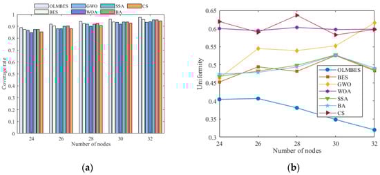 Analysis of the coverage rate and uniformity with the numbers of nodes: (a) the average coverage rate histogram for different numbers of nodes; (b) the average uniformity line chart for different numbers of nodes.