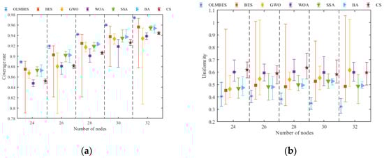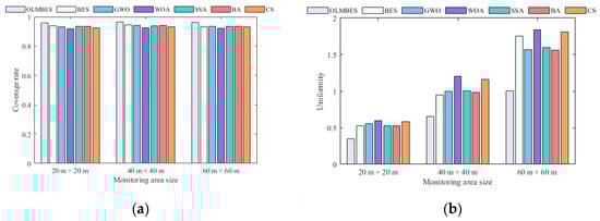 Figure 11a and Figure 11b, respectively, correspond to error bar graphs. By observing Figure 11a, it can be found that for the same number of sensor nodes, the solutions provided by OLMBES algorithm not only have the highest average coverage rate, but also possess the smallest difference between the optimal coverage rate and the worst coverage rate in multiple runs. It is indisputable that the OLMBES algorithm has the strongest stability. The BES algorithm displays distinct instability when optimizing the positions of sensor nodes. The coverage index fluctuates greatly and the stability is the weakest. The node deployment schemes provided by the GWO, WOA, SSA, and CS algorithms cannot meet the requirements for the effective coverage of monitoring areas. Figure 11b shows that the OLMBES algorithm provides the best node deployment scheme in terms of uniformity index compared to the other six algorithms. The proposed method can improve coverage efficiency, ensure the connectivity between nodes, and reduce the occurrence of coverage redundancy.
