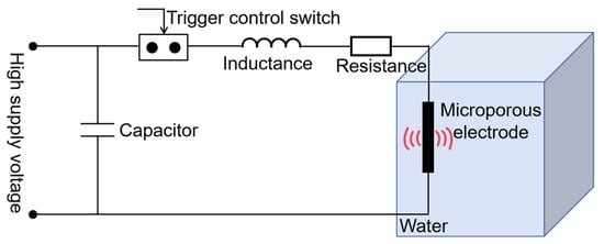 Figure 1 illustrates the working principle of the liquid–electrode micropore transmitting transducer. The micropore electrodes are immersed in water. When the trigger control switch is activated, the 220 V alternating current is transformed and rectified to produce a high supply voltage. The capacitor continuously stores energy. As soon as the trigger control switch is deactivated, the considerable energy stored in the capacitor is immediately released via the two ends of the micropore electrodes. This rapid release of energy causes the liquid between the micropore electrodes to break up, creating a shockwave discharge. This discharge phenomenon is known as the “liquid–electric effect” [37].