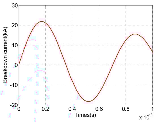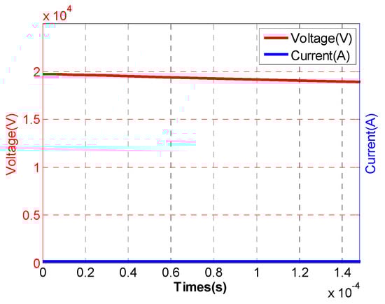 A micropore electrode model was established using finite element simulation software, with electrodes made of stainless steel. In the simulation, the equivalent circuit described in Section 2.3 replaced the external circuit for the discharge of the liquid–electric transducer, where the output part of the circuit was connected to the high-pressure and low-pressure electrodes of the electrode structure to provide voltage. The micropore electrode was fixed in a cubic water tank with a side length of 40 cm, filled with tap water. The circuit parameters and water parameters are listed in Table 1. A charging voltage of 20 kV was applied to the external circuit of the micropore electrode, leading to the breakdown of the micropore electrode, while real-time monitoring of the stored voltage, current, and other electroacoustic parameters was conducted. The simulation study analyzed the electroacoustic characteristics of the micropore electrode, and the voltage and current profiles at different times during the pre-breakdown process, the discharge current profile, and the shock wave pressure–time profile were plotted, as shown in Figure 4, Figure 5, and Figure 6, respectively.